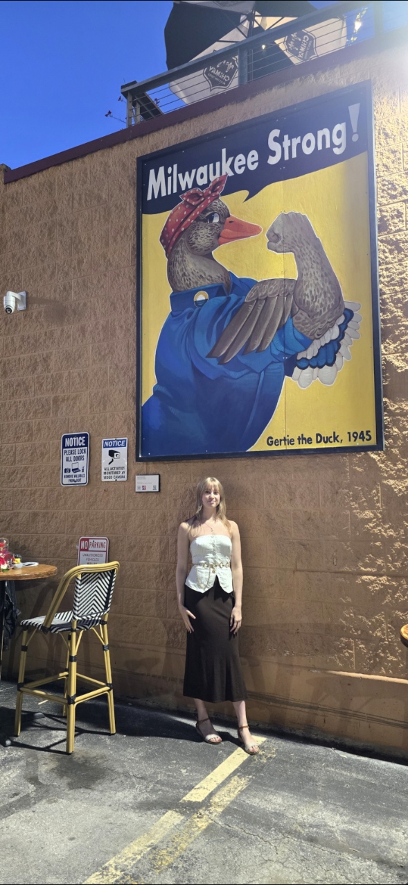 Rachel McNeilly's Gertie The Duck Mural was unveiled in the Fall of 2024 on the Café Benelux building in Milwaukee, Wisconsin.